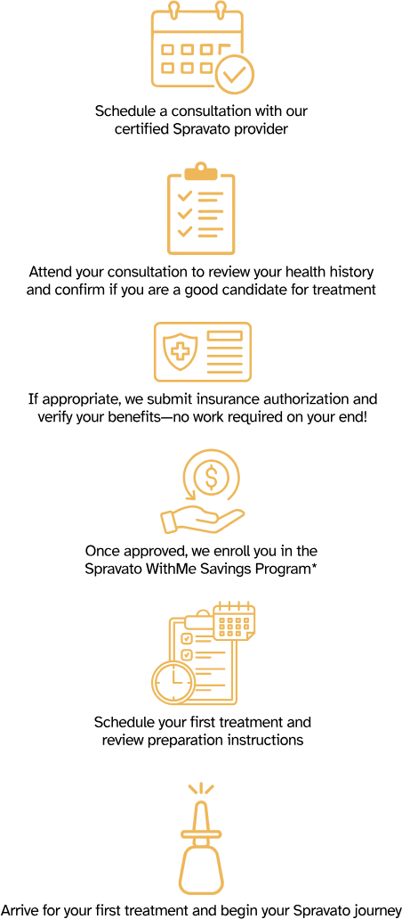 Most major insurance plans provide coverage for Spravato® (esketamine) when it is prescribed for treatment-resistant depression or major depressive disorder with suicidal thoughts. Coverage requirements can vary depending on your specific insurance plan. Our team manages the entire insurance authorization process for you—including benefits verification and prior authorization—so you can focus on preparing for treatment rather than dealing with paperwork. We’ll also discuss any potential out-of-pocket costs with you before starting care, so there are no surprises.